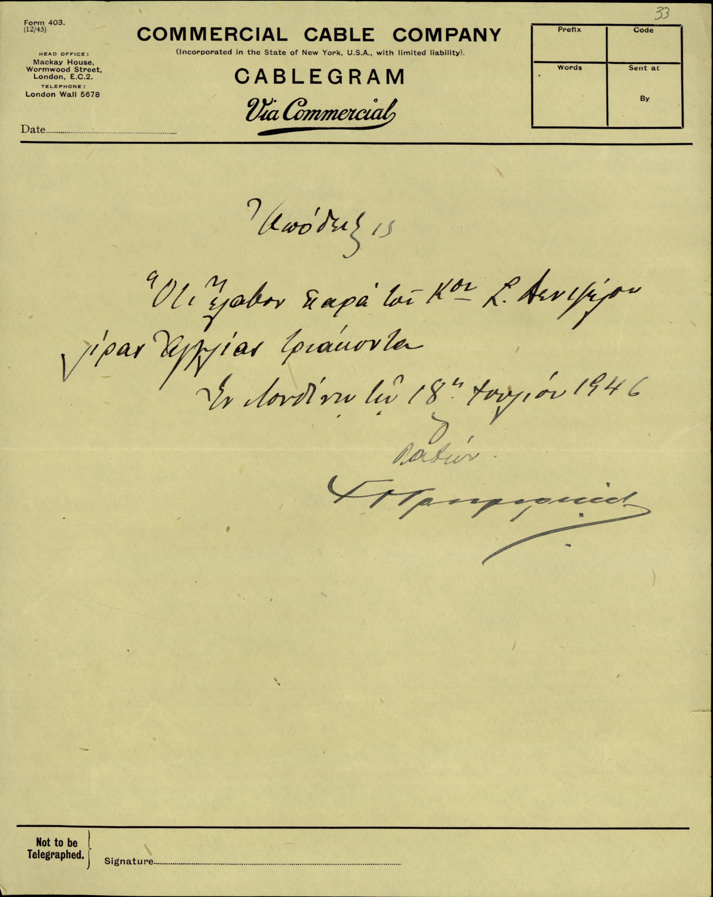 | ΤΙΤΛΟΣ | Τηλεγράφημα του Δ.Κακλαμάνου προς το Υπουργείο Εξωτερικών για τον Ελ.Βενιζέλο σχετικά με την πρόοδο της υγείας του γιού του, Σοφοκλή. |