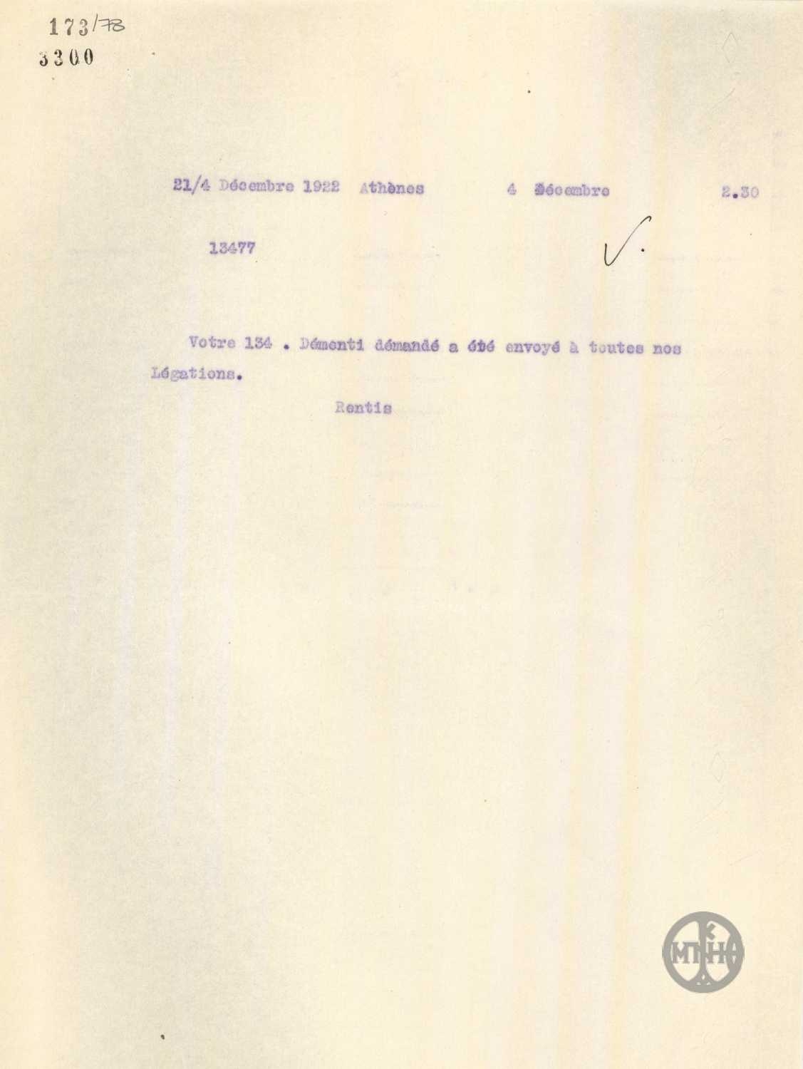 | ΤΙΤΛΟΣ | Τηλεγράφημα του Στ.Γονατά προς την Ελληνική Αποστολή στη Λωζάννη σχετικά με νέα παραβίαση της συμφωνίας ανταλλαγής των πληθυσμών. |