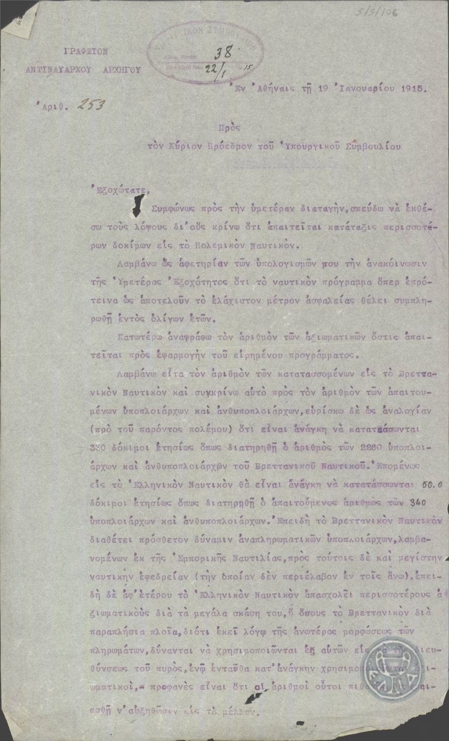 | ΤΙΤΛΟΣ | Επιστολή προς τον Ε.Βενιζέλο σχετικά με την ανάγκη κατάταξης περισσότερων δοκίμων στο Πολεμικό Ναυτικό. |