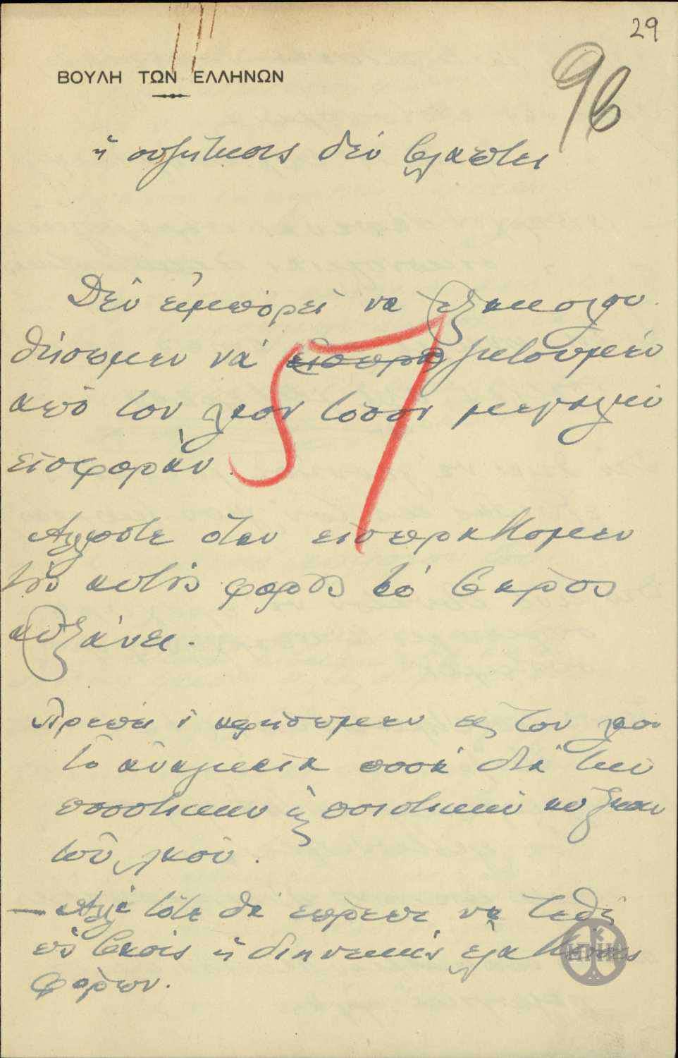 | ΤΙΤΛΟΣ | Σημείωμα του Ε.Βενιζέλου, όπου σχολιάζει αγόρευση του Π.Τσαλδάρη. |