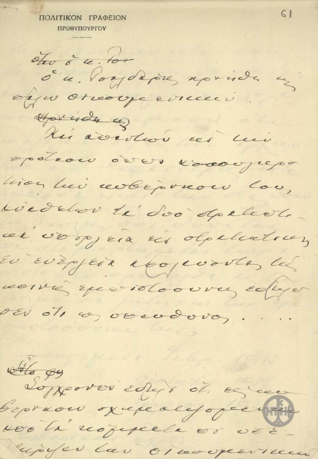 | ΤΙΤΛΟΣ | Σημείωμα του Ε.Βενιζέλου σχετικά με την πολιτική της κυβέρνησης Τσαλδάρη. |