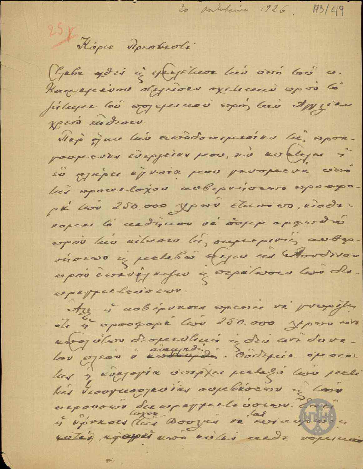 | ΤΙΤΛΟΣ | Επιστολή του Π.Πρωτοπαπαδάκη σχετικά με τους λογαριασμούς του Ε.Βενιζέλου στην Εθνική Τράπεζα. |
