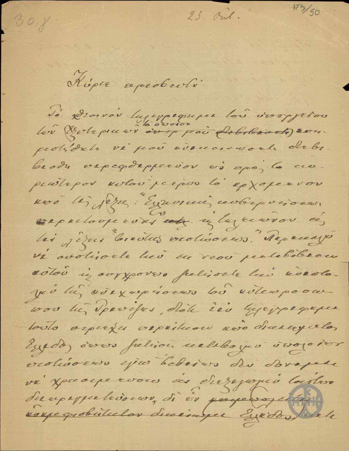 | ΤΙΤΛΟΣ | Επιστολή του Ε.Βενιζέλου προς το Ι.Ευταξία, με την οποία του ζητεί να παραιτηθεί από τη θέση του Διοικητή της Εθνικής Τράπεζας. |