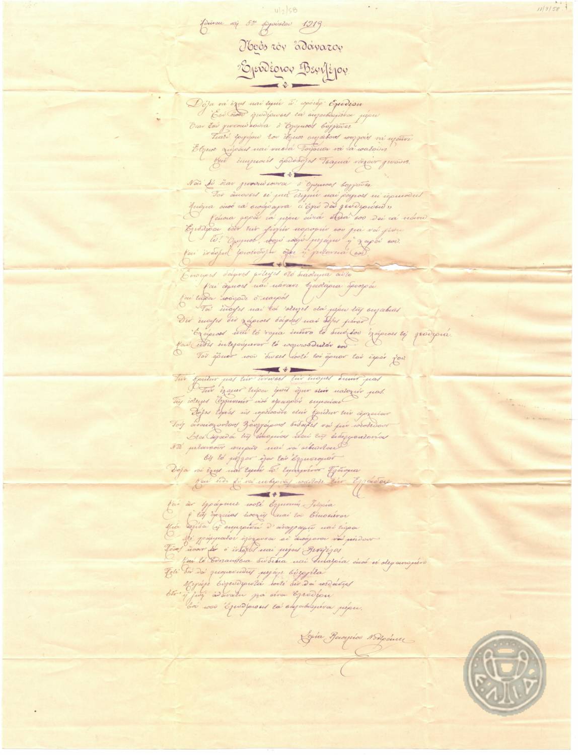 | ΤΙΤΛΟΣ | Επιστολή του Α.Βέλλη προς τον Ε.Βενιζέλο, με την οποία αποστέλλει ποιήματα του. |
