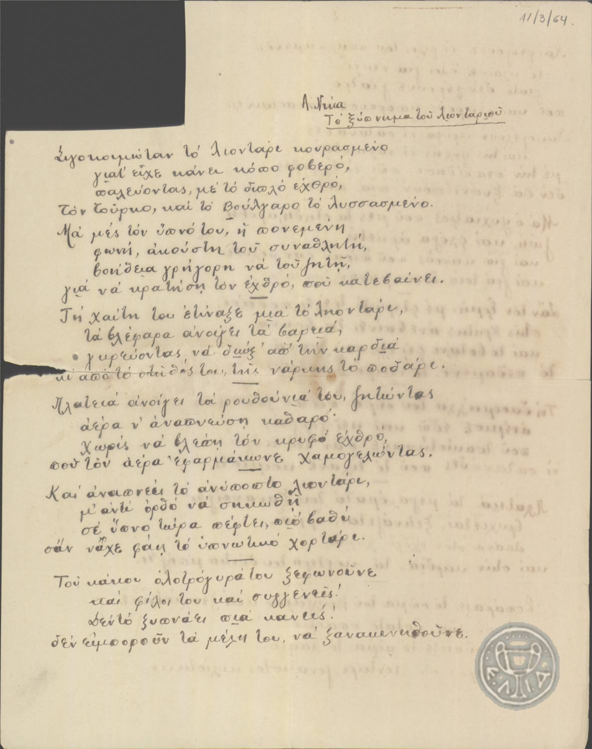 | ΤΙΤΛΟΣ | Ποίημα του Λ.Νίκα αφιερωμένο στον Ε.Βενιζέλο με τίτλο :"Το Ξύπνημα του λιονταριού". |
