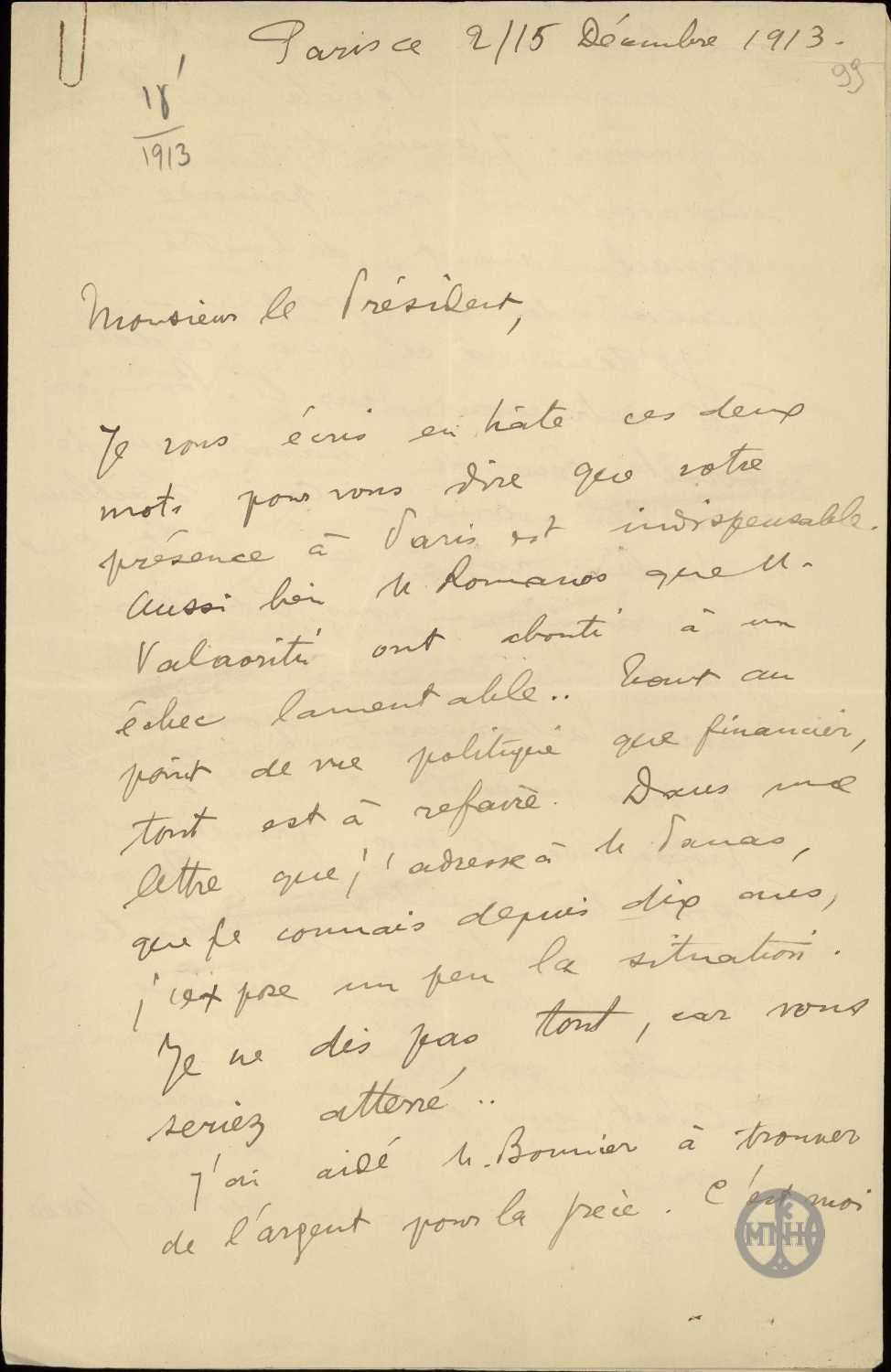 | ΤΙΤΛΟΣ | Επιστολή του Λ.Μακκά προς τον Ε.Βενιζέλο σχετικά με τη δημιουργία μίας Ligue Interventioniste Hellénique στο Παρίσι ή στο Λονδίνο. |