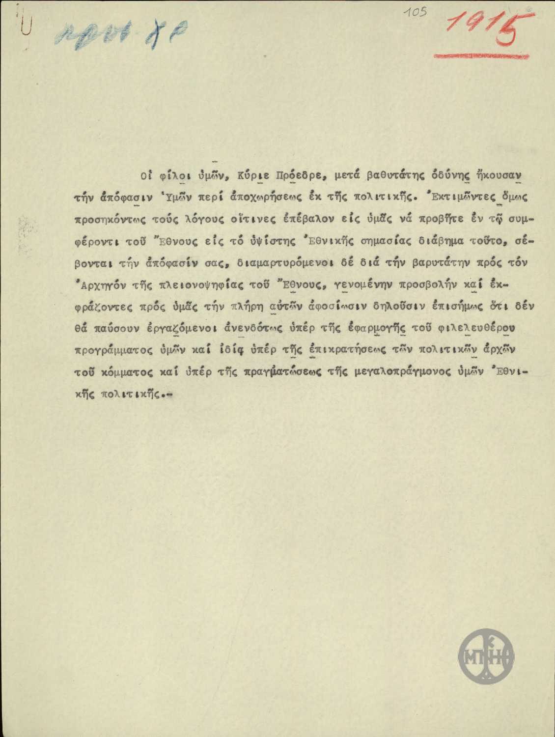 | ΤΙΤΛΟΣ | Επιστολή προς τον Ε.Βενιζέλο σχετικά με την αποχώρησή του από την Κυβέρνηση. |