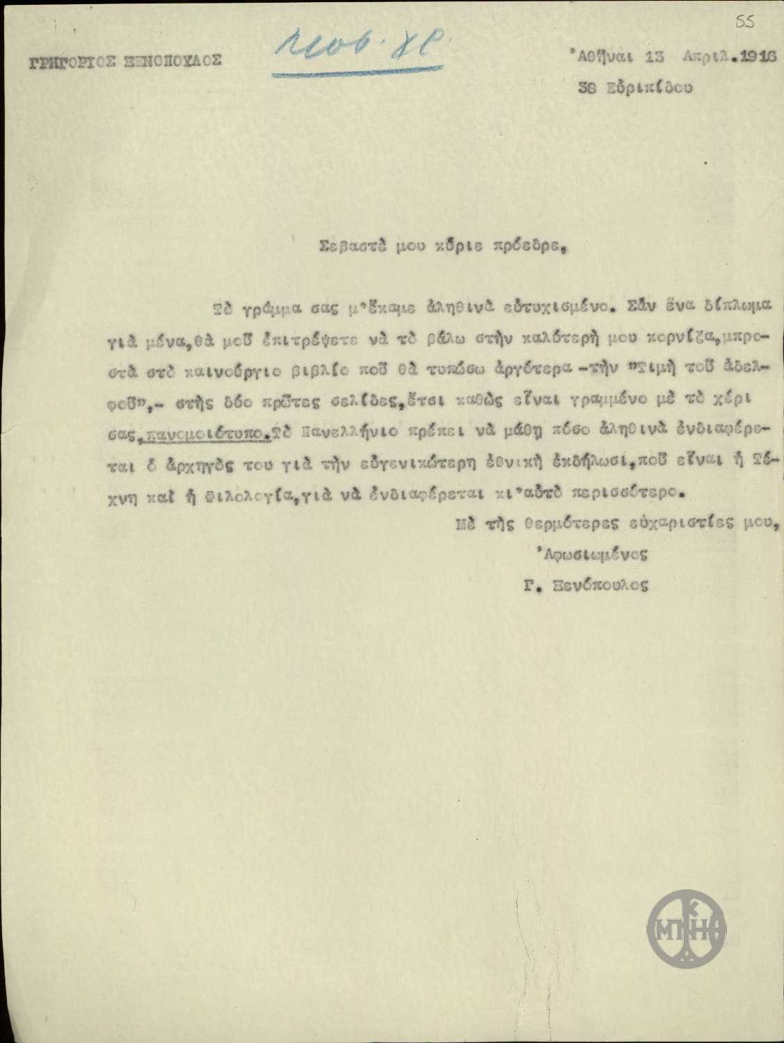 | ΤΙΤΛΟΣ | Ευχαριστήρια επιστολή του Γ.Ξενόπουλου προς τον Ε.Βενιζέλο. |