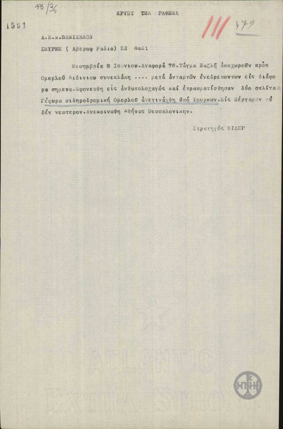 | ΤΙΤΛΟΣ | Τηλεγράφημα του Κ.Νίδερ προς τον Ε.Βενιζέλο για την επίθεση τάγματος που αποσυρόταν από το Ναζλή. |