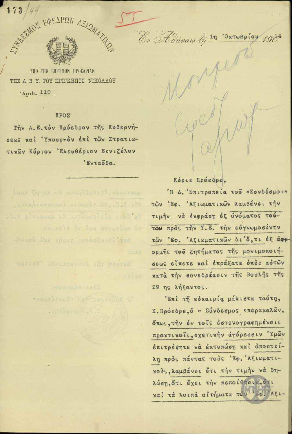 | ΤΙΤΛΟΣ | Επιστολή προς τον Ε.Βενιζέλο σχετικά με την πληρωμή χρωστούμενου ποσού σε αξιωματικούς. |