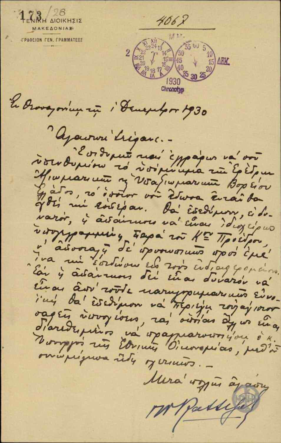 | ΤΙΤΛΟΣ | Επιστολή του Γενικού Γραμματέα της Τεχνικής Διοίκησης Μακεδονίας προς τον Στ.Στεφάνου σχετικά με την απάντηση στο υπόμνημα των Εφέδρων Αξιωματικών. |