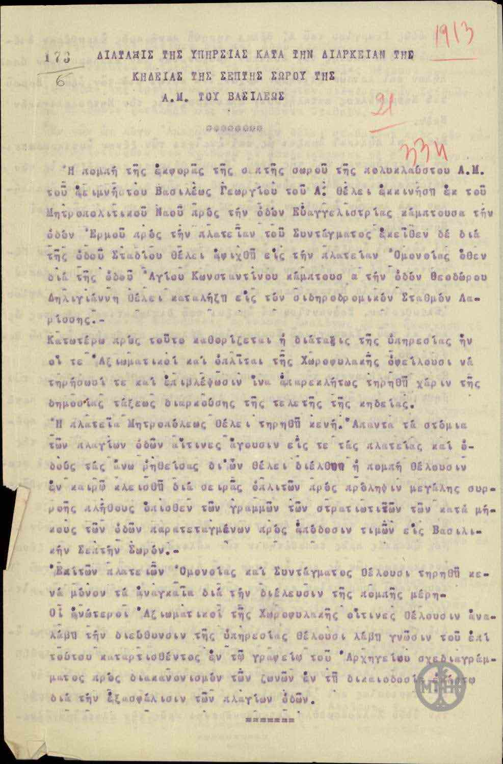 | ΤΙΤΛΟΣ | Διάταξις της υπηρεσίας κατά την διάρκειαν της κηδείας της σεπτής σωρού της Α.Μ. του Βασιλέως. |