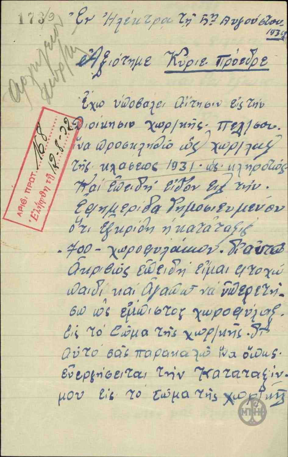 | ΤΙΤΛΟΣ | Αίτηση του Γ.Σχοινάκη προς τον Ε.Βενιζέλο με την οποία ζητεί να μην παραιτηθεί από την Χωροφυλακή. |
