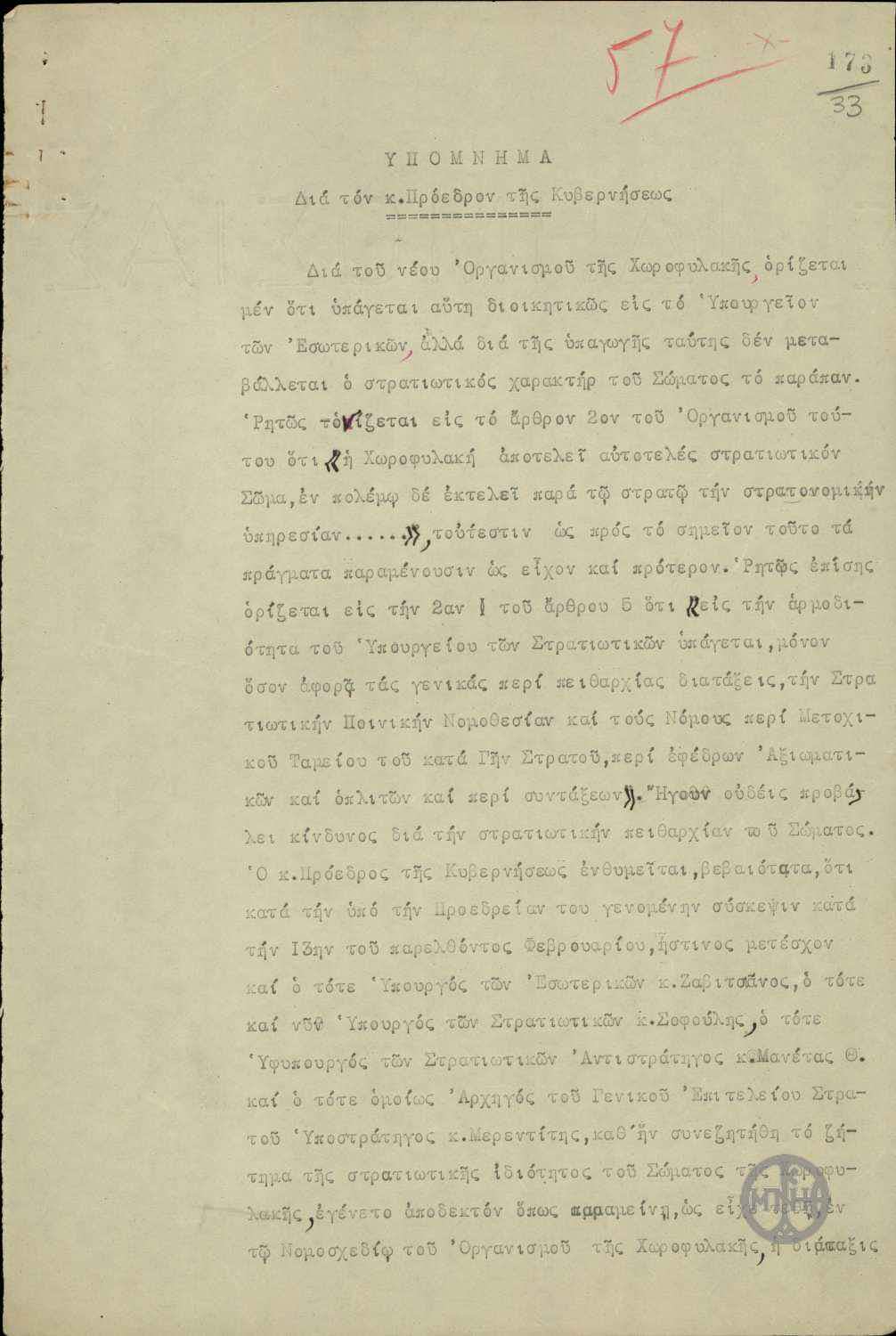| ΤΙΤΛΟΣ | Υπόμνημα του Διευθυντή Χωροφυλακής και Δημόσιας Ασφάλειας προς τον Ε.Βενιζέλο σχετικά με διοικητικές αλλαγές στη Χωροφυλακή. |