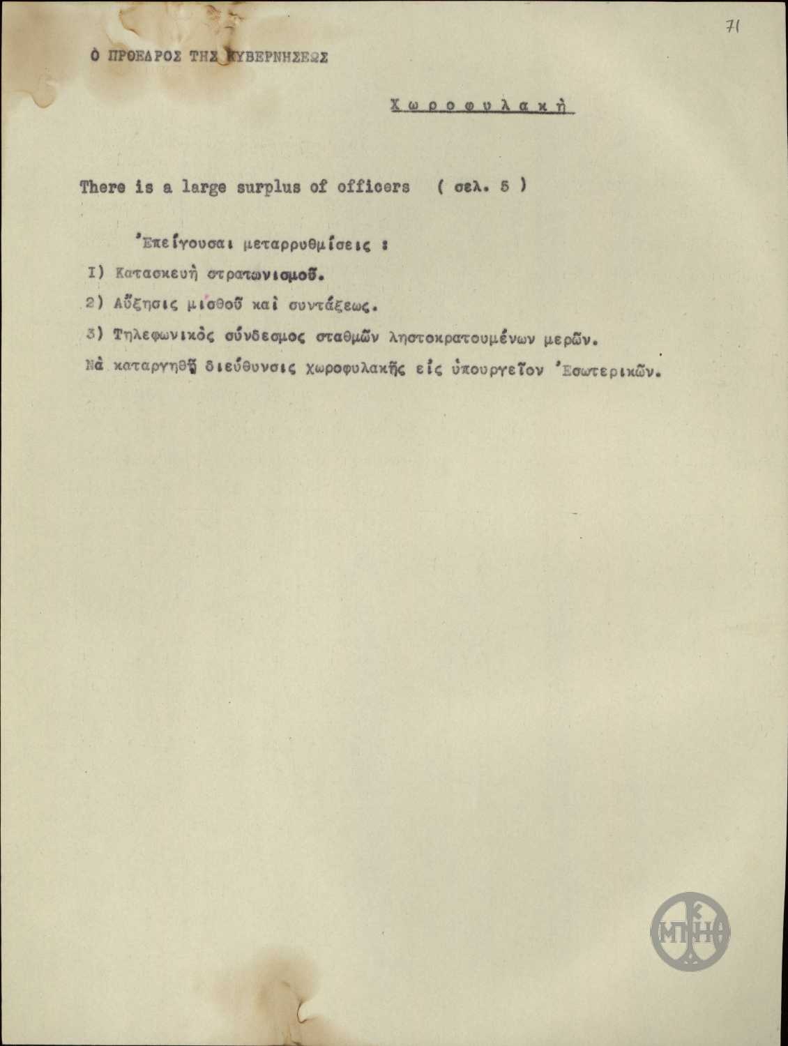 | ΤΙΤΛΟΣ | Σημείωμα του Ε.Βενιζέλου σχετικά με την απομάκρυνση υπεράριθμων χωροφυλάκων από την Ελληνική Χωροφυλακή. |