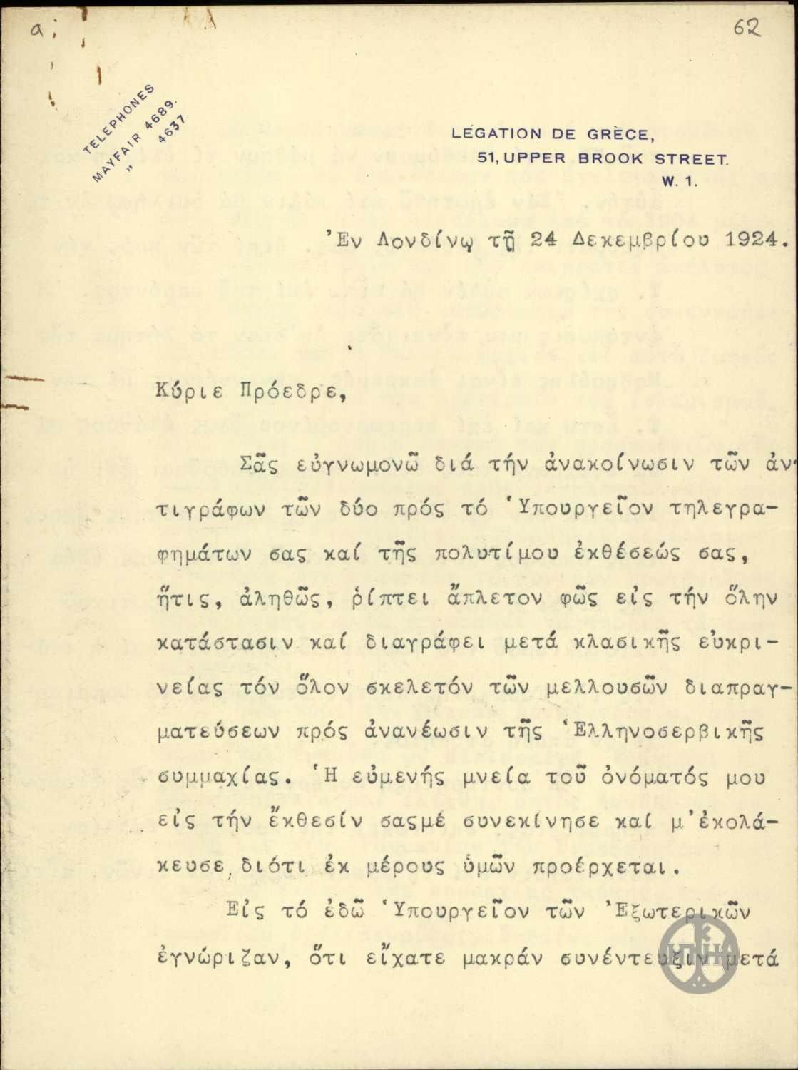 | ΤΙΤΛΟΣ | Επιστολή του Δ.Κακλαμάνου προς τον Ε.Βενιζέλο σχετικά με την ανανέωση της Ελληνοσερβικής Συμμαχίας, τις σχέσεις Ελλάδας-Τουρκίας, τη Μικρή Συνεννόηση, τις σχέσεις Ιταλίας-Γιουγκοσλαβίας και την ακύρωση του Πρωτοκόλλου της Γενεύης. |