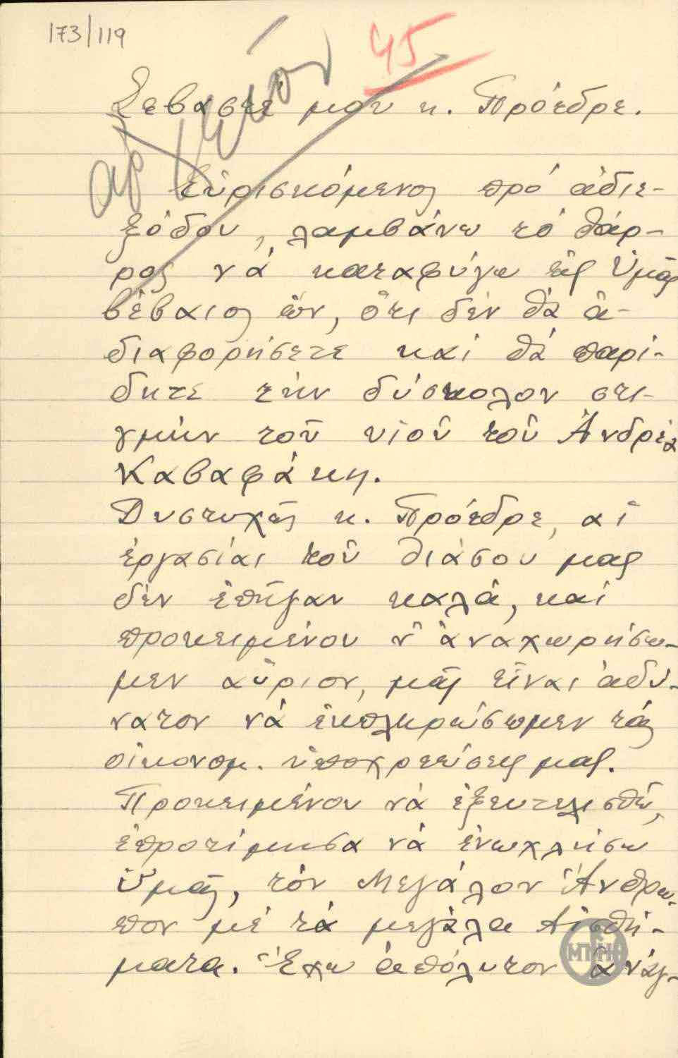 | ΤΙΤΛΟΣ | Επιστολή του Δ.Ν.Φιλάρετου προς τον Ε.Βενιζέλο σχετικά με την κατάθεση επερώτησης για τα οικονομικά των βουλευτών και των γερουσιαστών. |
