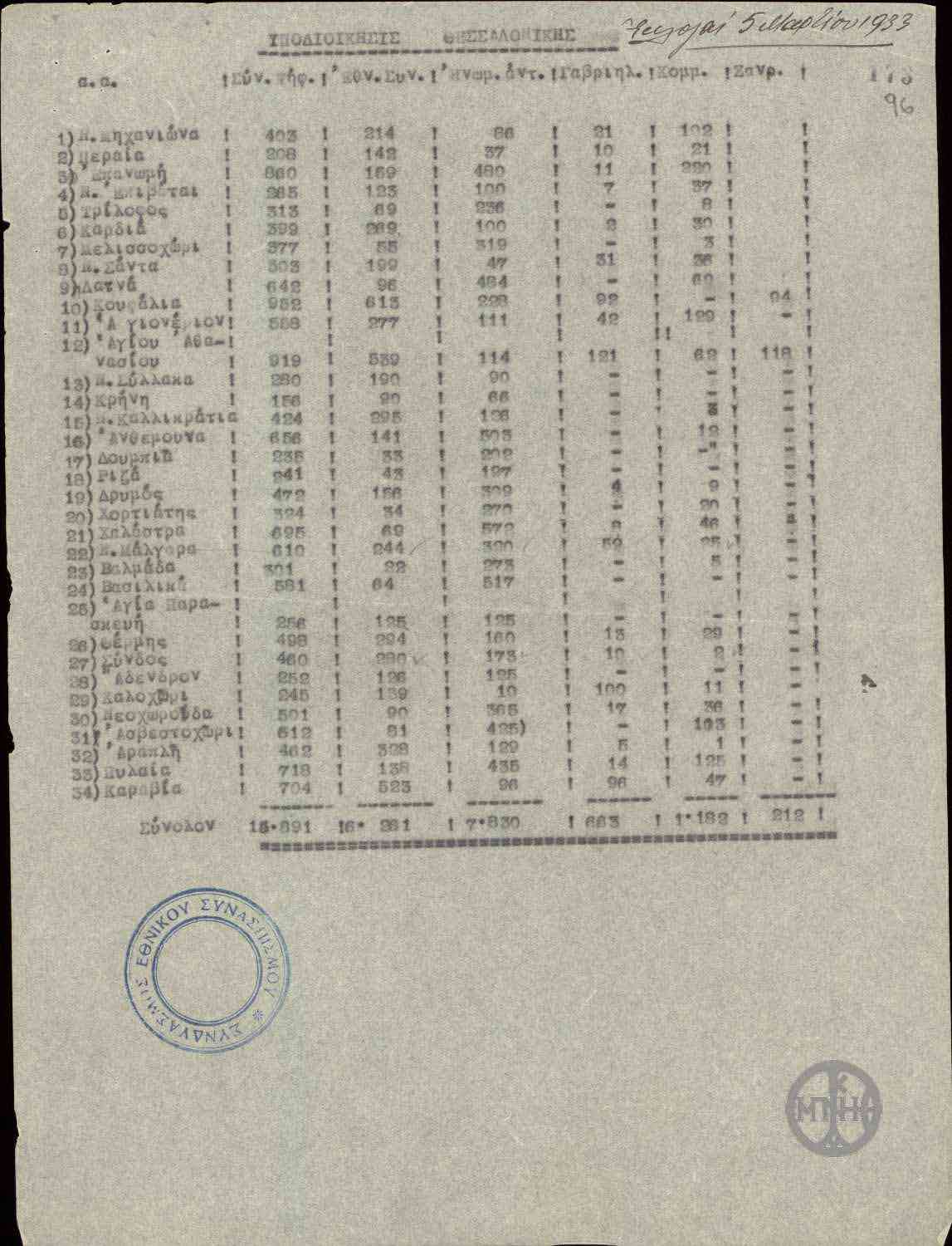 | ΤΙΤΛΟΣ | Αποτελέσματα των εκλογών της 5ης Μαρτίου 1933 στην υποδιοίκηση Θεσσαλονίκης. |