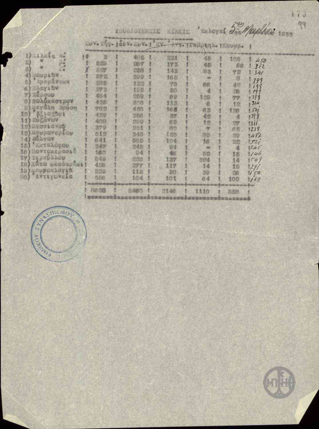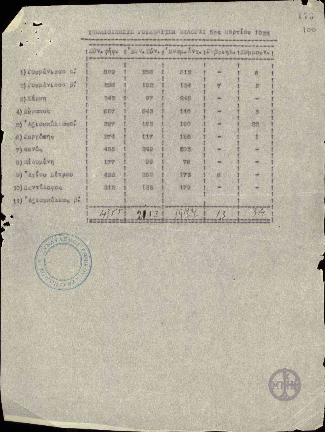 | ΤΙΤΛΟΣ | Αποτελέσματα των εκλογών της 5ης Μαρτίου 1933 στην υποδιοίκηση Γουμενιτση. |