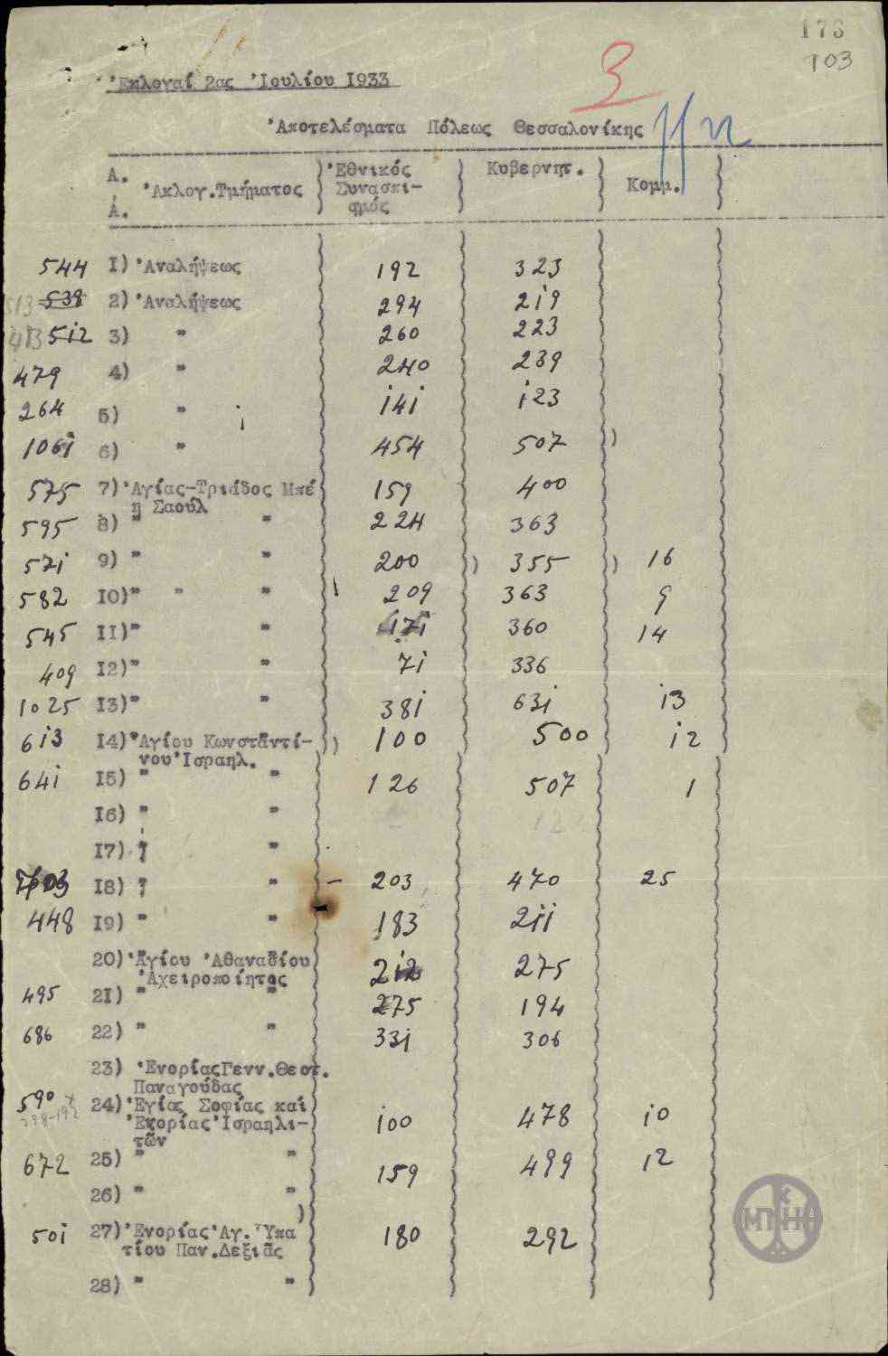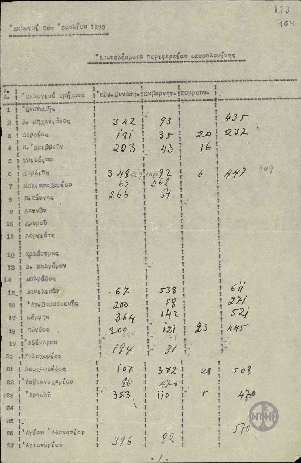 | ΤΙΤΛΟΣ | Αποτελέσματα εκλογών της 2ης Ιουλίου 1933 περιφέρειας Θεσσαλονίκης. |