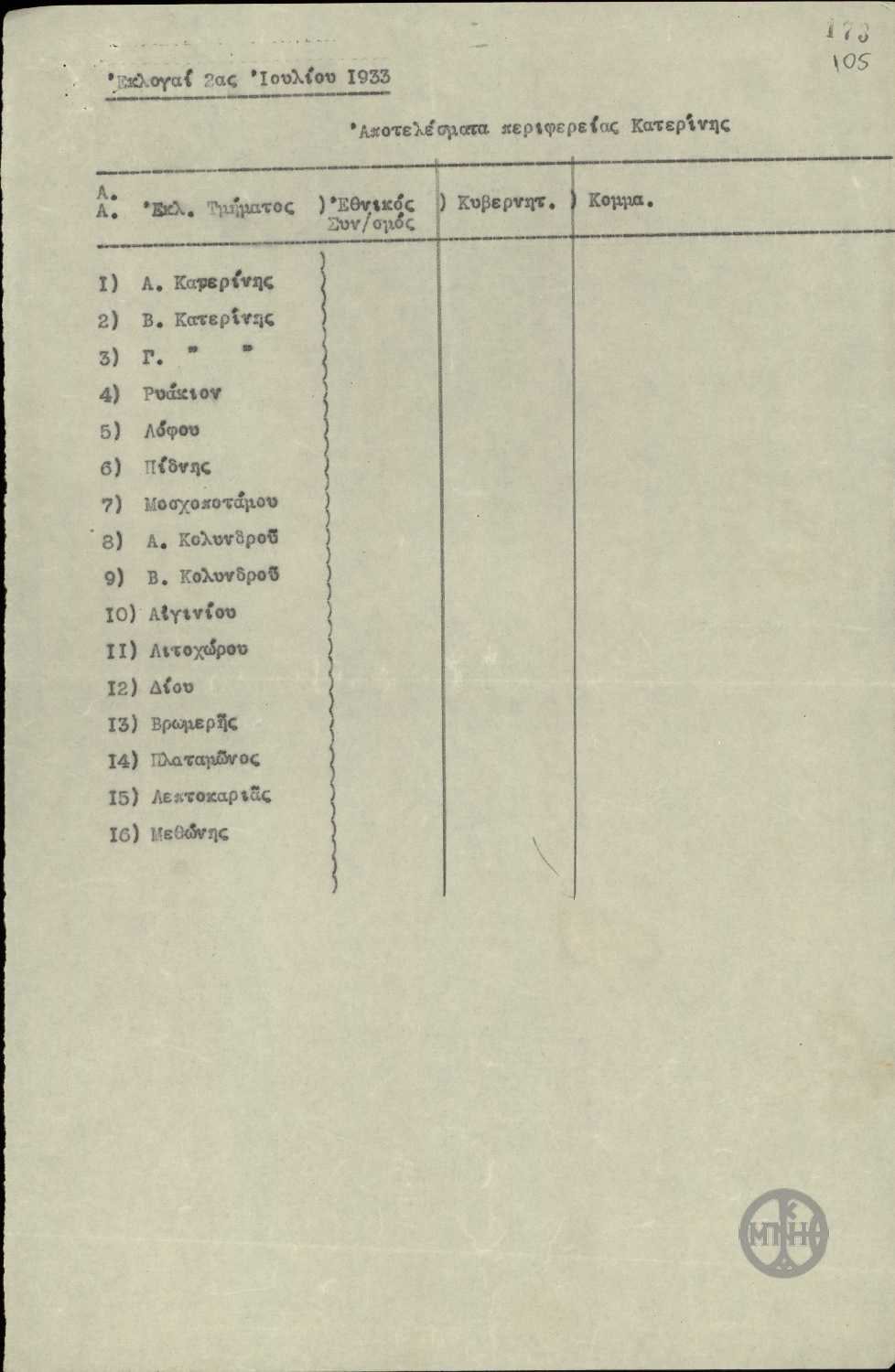 | ΤΙΤΛΟΣ | Αποτελέσματα εκλογών της 2ης Ιουλίου 1933 της περιφέρειας Κατερίνης. |