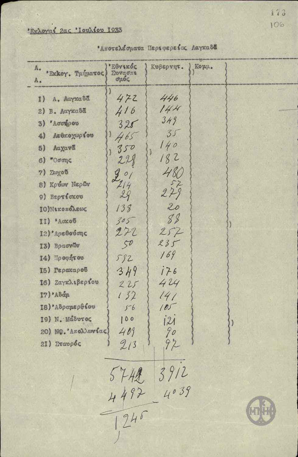 | ΤΙΤΛΟΣ | Αποτελέσματα εκλογών της 2ας Ιουλίου 1933 περιφέρειας Λαγκαδά. |