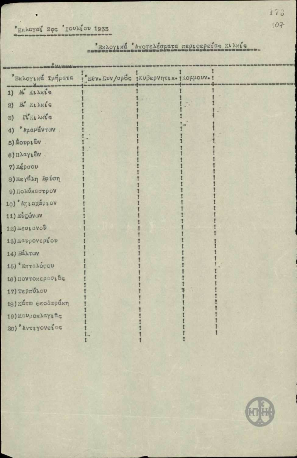 | ΤΙΤΛΟΣ | Αποτελέσματα εκλογών της 2ας Ιουλίου 1933 περιφέρειας Κιλκίς. |