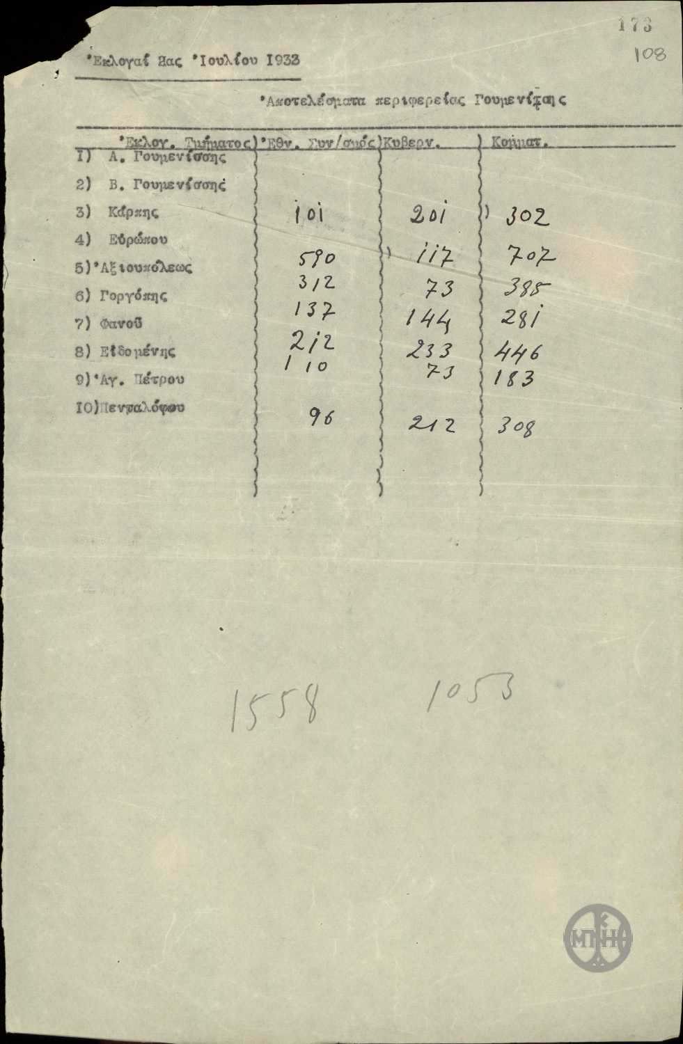 | ΤΙΤΛΟΣ | Αποτελέσματα εκλογών της 2ας Ιουλίου 1933 περιφερείας Γουμενίτσης. |