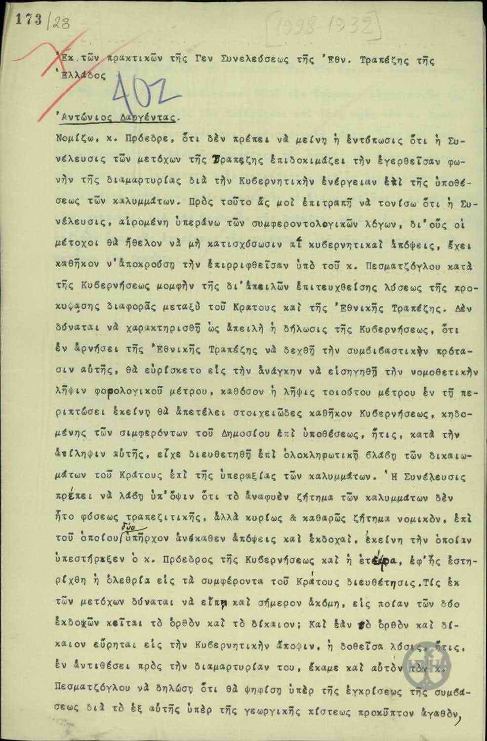 | ΤΙΤΛΟΣ | Απόσπασμα από τα πρακτικά της Γενικής Συνέλευσης της Εθνικής Τράπεζας της Ελλάδας. |