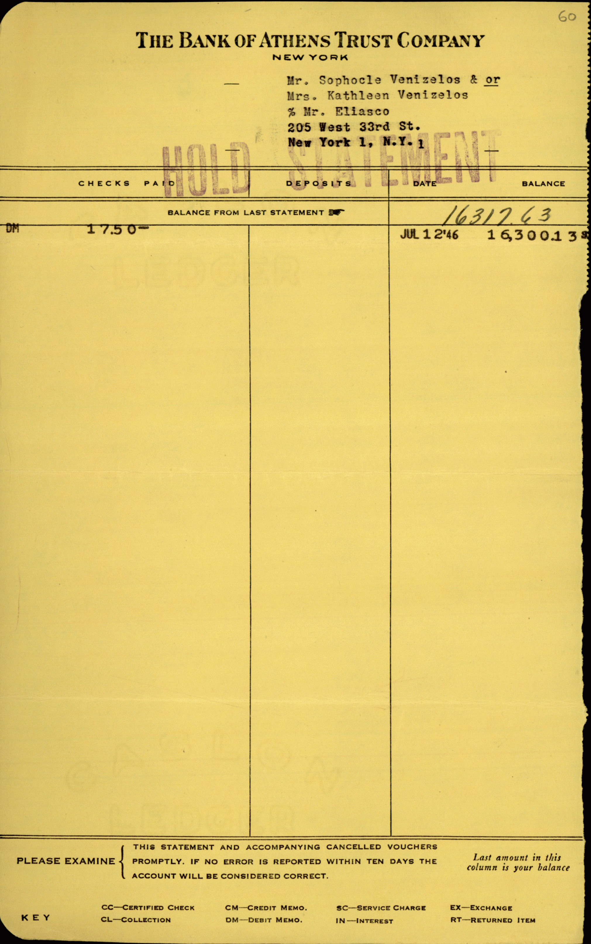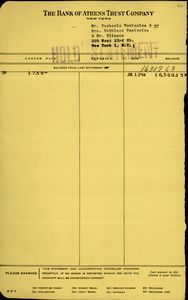 | ΤΙΤΛΟΣ | Απόδειξη της Bank of Athens Trust Company για το υπόλοιπο λογαριασμού του Σ. Βενιζέλου. |