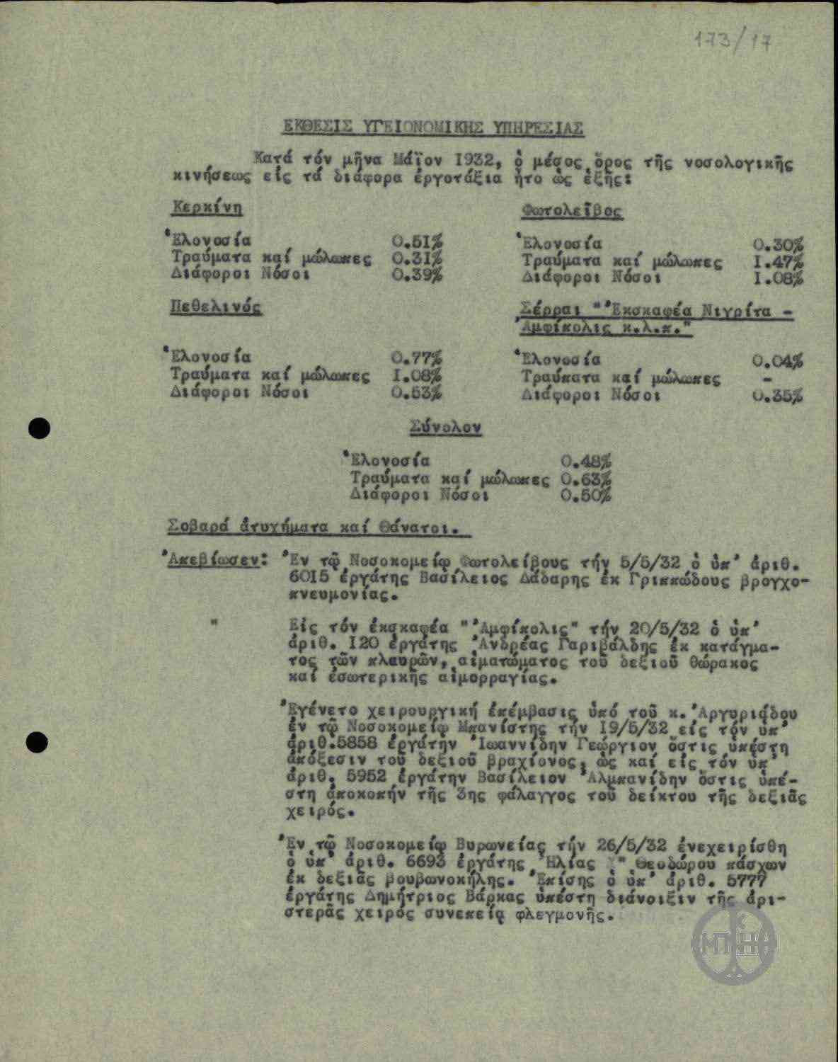| ΤΙΤΛΟΣ | Έκθεση Υγειονομικής Υπηρεσίας σχετικά με τη νοσολογική κίνηση στα διάφορα εργοτάξια των υδραυλικών έργων των πεδιάδων Σερρών-Δράμας. |