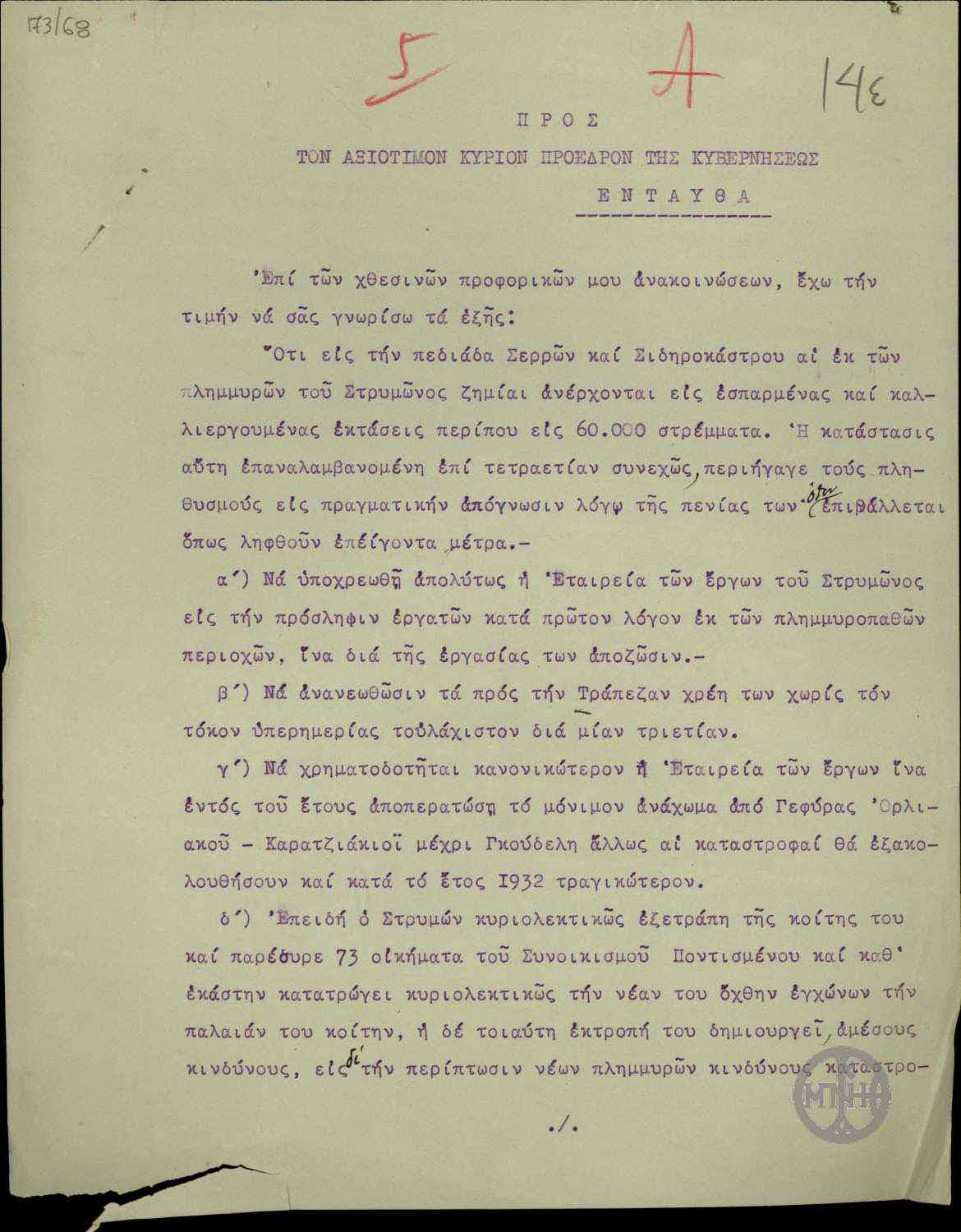 | ΤΙΤΛΟΣ | Σημείωμα του Γενικού Διευθυντή Τεχνικών Έργων, Α.Τσαλίκη σχετικά με τη συμπλήρωση της κρατικής προκαταβολής δια τα αντιπλημμυρικά έργα Πηνειού. |