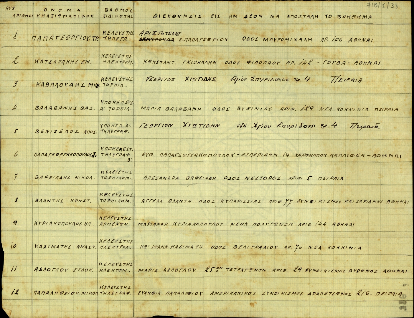| ΤΙΤΛΟΣ | Πίνακας στον οποίο καταγράφονται ονόματα αξιωματικών που δικαιούνται βοήθημα και οι διευθύνσεις που μπορεί να αποσταλεί. |