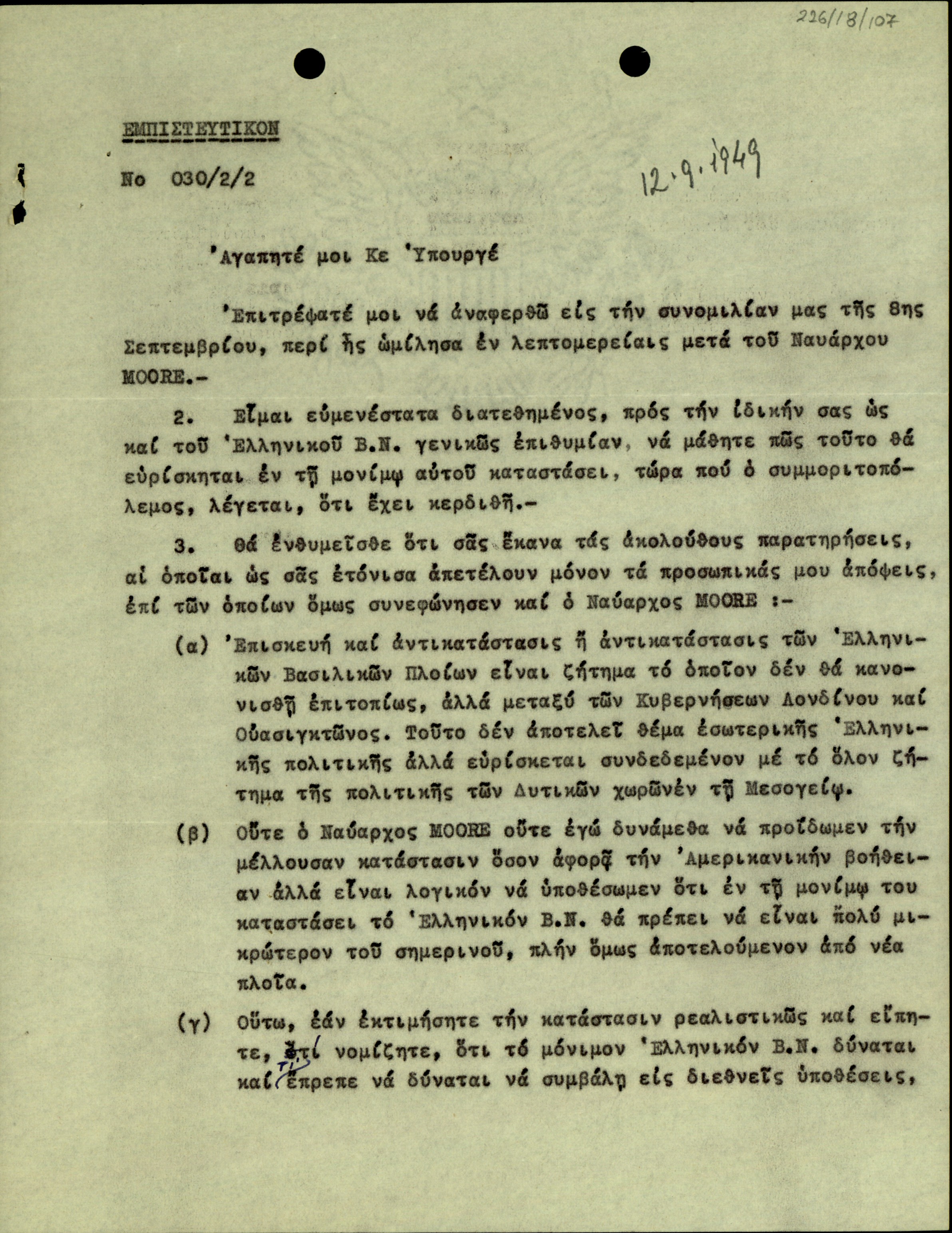 | ΤΙΤΛΟΣ | Επιστολή του R. K. Dickson προς τον Υπουργό Ναυτικών της Ελλάδας σχετικά με τις απόψεις του για τη μόνιμη κατάσταση του Ελληνικού Ναυτικού μετά τη λήξη του συμμοριτοπόλεμου. |