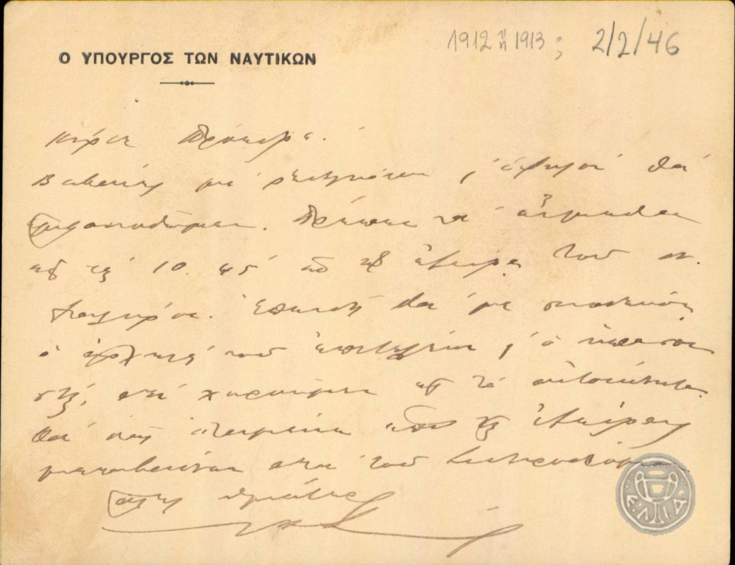 | ΤΙΤΛΟΣ | Επιστολή του Κ. Δεληγιώργη προς τον Ε. Βενιζέλο με την οποία υποβάλλει υπόμνημα σχετικά με την οργάνωση του ναυτικού. |