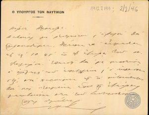 | ΤΙΤΛΟΣ | Επιστολή του πλοιάρχου Ι. Π. Φαφουτάκη προς τον Σ. Βενιζέλο σχετικά με το ζήτημα της νομιμοποίησης της στολής του Εμπορικού Ναυτικού. |