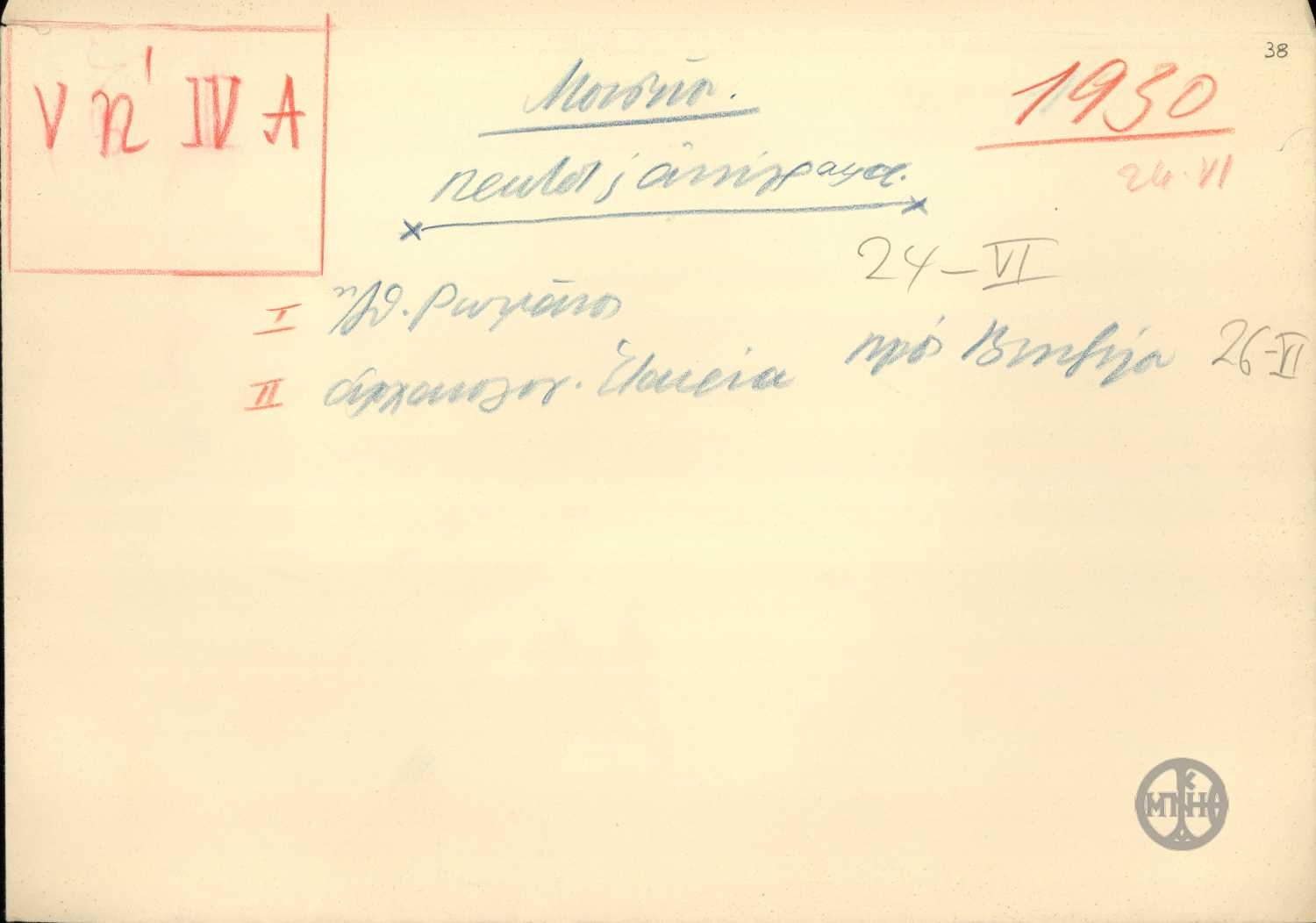 | ΤΙΤΛΟΣ | Φάκελος με ενδείξεις: Μουσείον, Πρωτoτ. και αντίγραφα, I. Αθ. Ρωμάνος, 24-VI και II. Αρχαιολογ. Εταιρεία προς Βενιζέλον, 26-VI. |