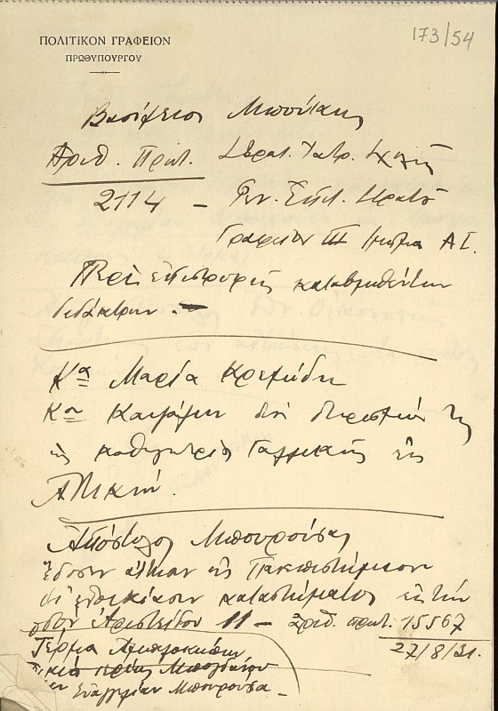 | ΤΙΤΛΟΣ | Σημείωμα του Κλέαρχου Μαρκαντωνάκη σχετικά με την άφιξη της τριανδίας και μελών του Υπουργικού Συμβουλίου και την υποβολή στο βασιλιά του καταλόγου του νέου Υπουργικού Συμβουλίου. |