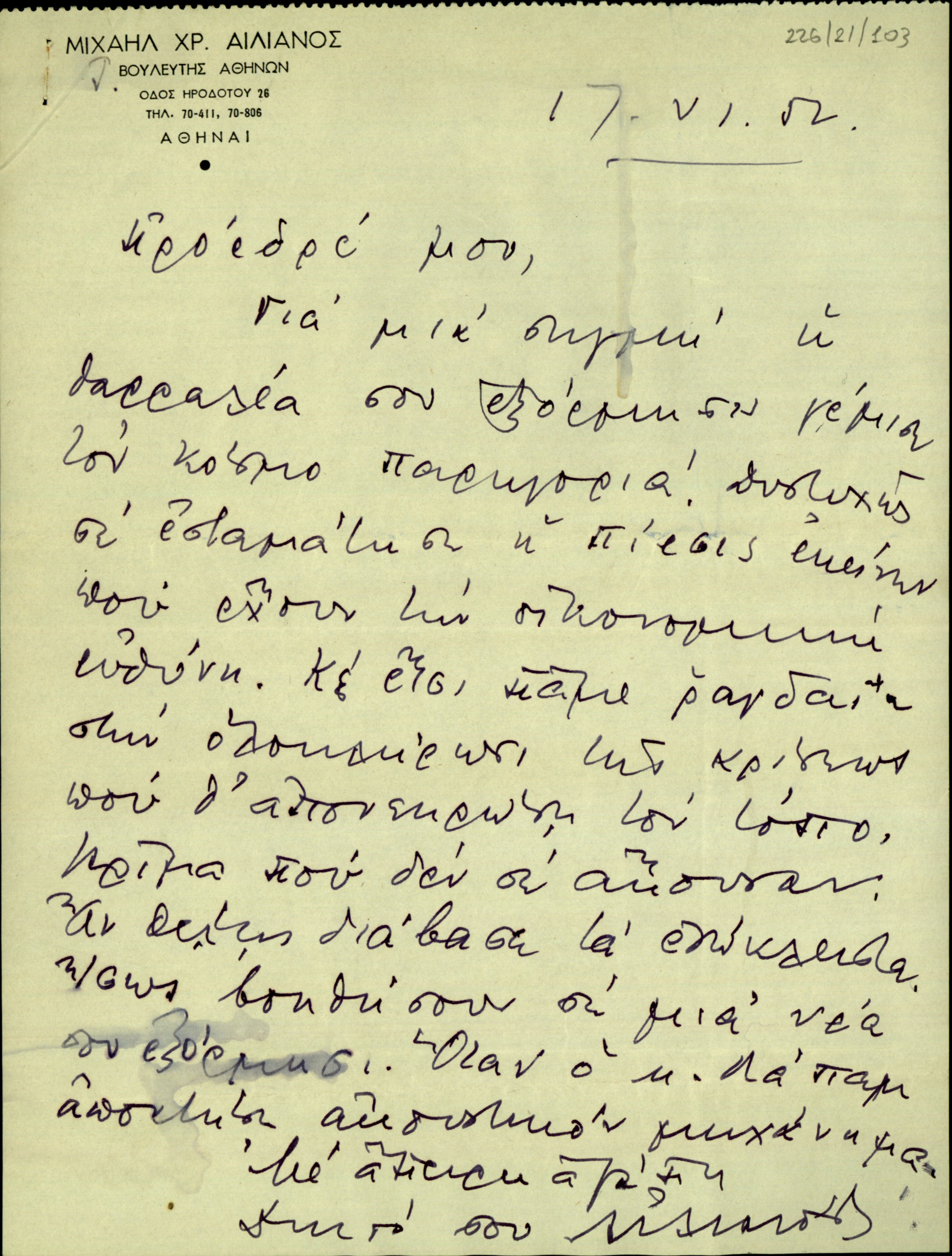 | ΤΙΤΛΟΣ | Επιστολή του Μιχαήλ Χρ. Αιλιανού προς τον Σ. Βενιζέλο με την οποία του εκφράζει την απογοήτευσή του για το γεγονός ότι δεν εισακούστηκε η οικονομική πολιτική του. |