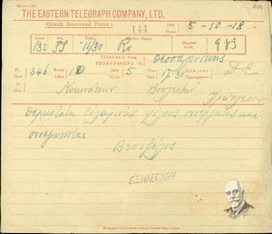 | ΤΙΤΛΟΣ | Τηλεγράφημα του Ελευθερίου Βενιζέλου προς το Γ. Κοκκινάκη, στο οποίο διατυπώνει τις ευχαριστίες του προς φίλους, συνεργάτες και συναγωνιστές. |