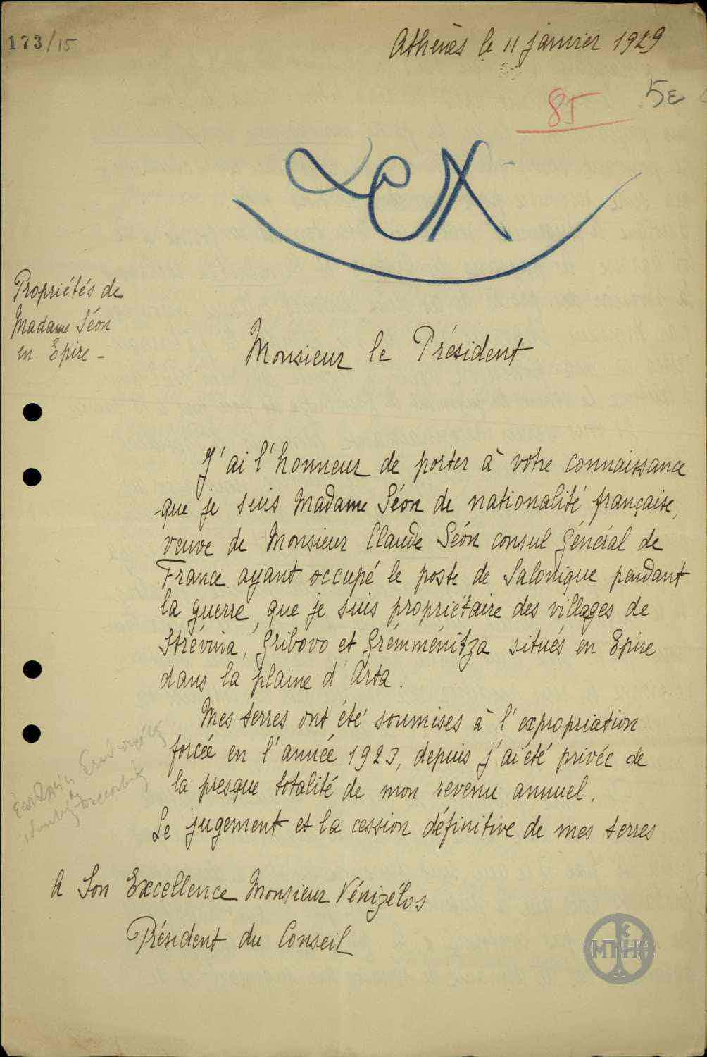 | ΤΙΤΛΟΣ | Επιστολή της Γαλλίδας υπηκόου Seon προς τον Ε. Βενιζέλο με την οποία του ζητά να παρέμβει ώστε να να μην εκτελεστούν δικαστικές αποφάσεις που θα της στερήσουν την έγγεια περιουσία της και μοναδική πηγή βιοπορισμού, που βρίσκεται στην ευρύτερη περιοχή της Άρτας. |