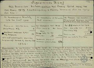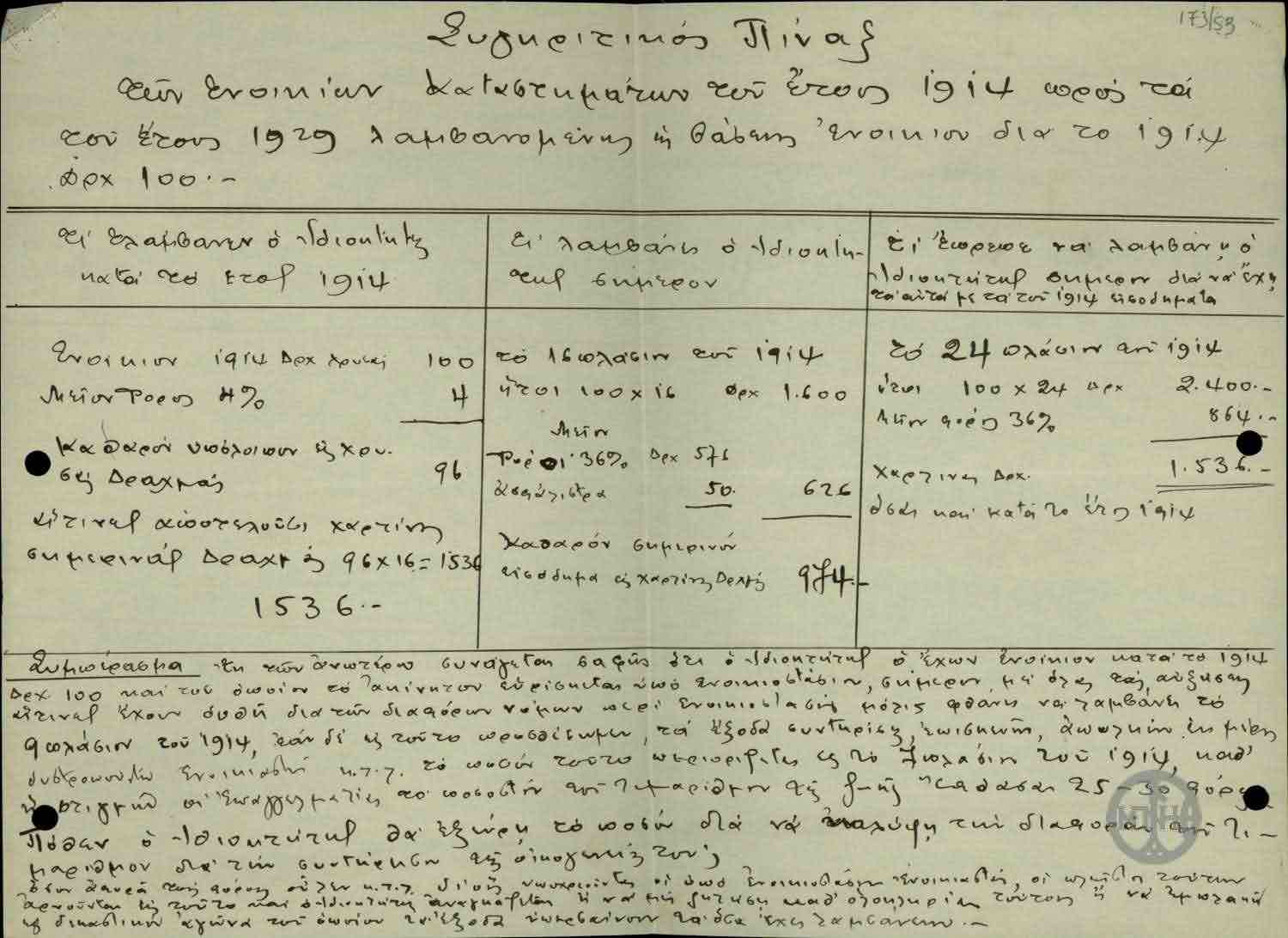 | ΤΙΤΛΟΣ | Πίνακας με τίτλο: Συγκριτικός Πίναξ των ενοικίων καταστημάτων του έτους1914 προς τα του έτους 1929 λαμβανομένης της βάσεως ενοικίου δια το 1914 δρχ. 100. |