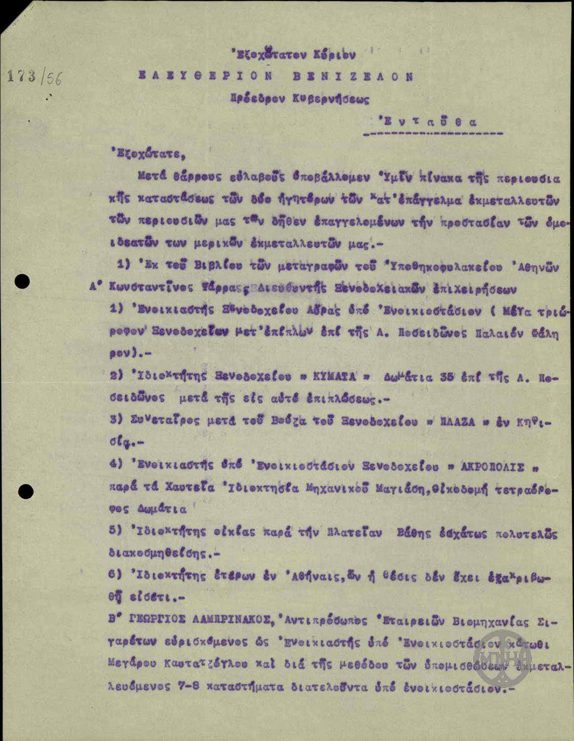 | ΤΙΤΛΟΣ | Σημείωμα της Επιτροπής των Μικροϊδιοκτητών προς τον Ε. Βενιζέλο για την οικονομική κατάσταση του Διευθυντή Ξενοδοχειακών Επιχειρήσεων Κωνσταντίνου Ψαρρά και του Αντιπροσώπου Εταιρειών Βιομηχανίας Σιγαρέτων Γεωργίου Λαμπρινάκου εκπροσώπων των ενοικιαστών επαγγελματικών χώρων. |